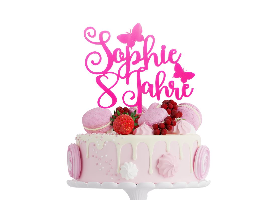 Machen Sie die Geburtstagstorte Ihrer Tochter zu einem unvergesslichen Highlight mit unserem bezaubernden Cake Topper „Name und Zahl mit Schmetterlingen“. Dieser elegante Topper aus hochwertigem Acryl ist in den Farben Pink, Weiß und Schwarz erhältlich und wird in einer stilvollen Kalligrafie-Schrift gestaltet. Der Topper wird durch zarte Schmetterlinge ergänzt, die dem Design eine besonders feminine Note verleihen.