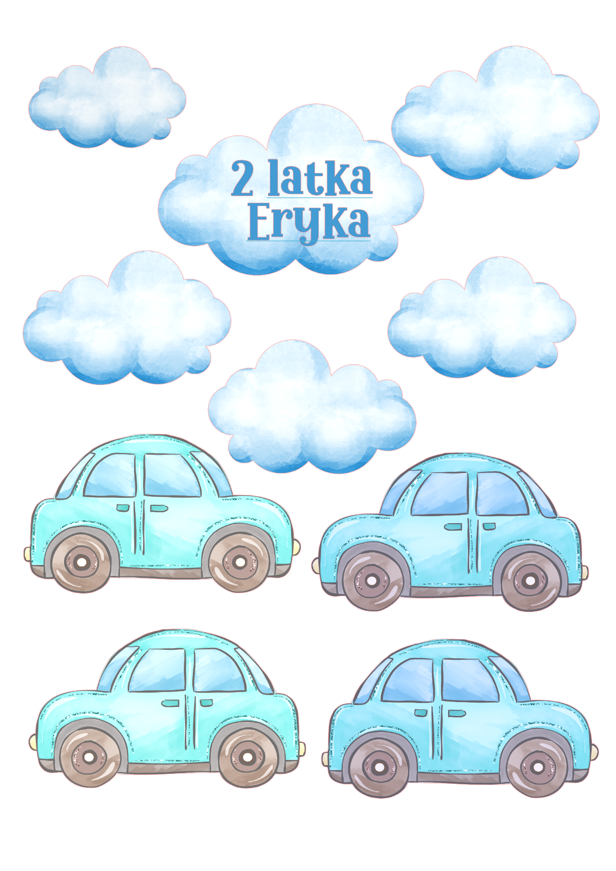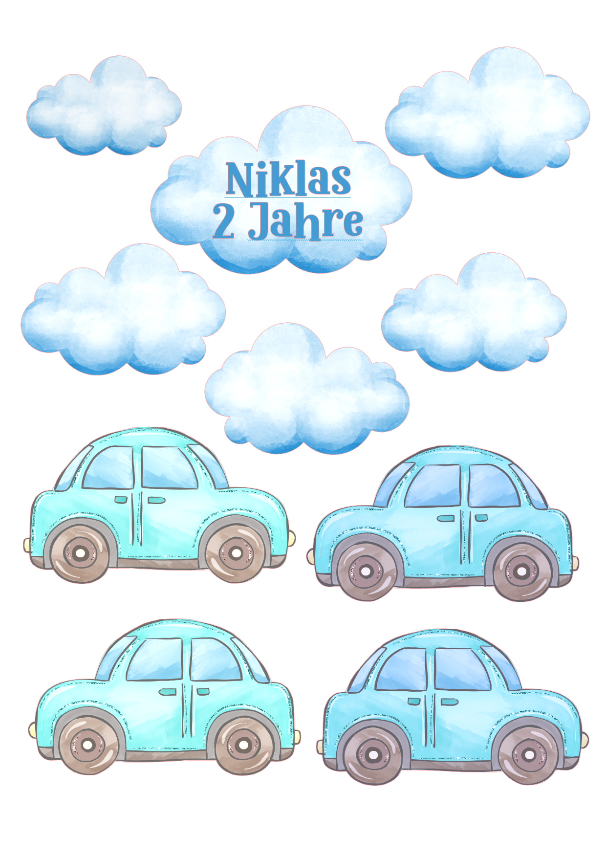 Essbarer Ausdruck mit blauen Baby-Autos und Wolken, personalisierbar mit Name und Alter, ideal für Jungen-Torten.