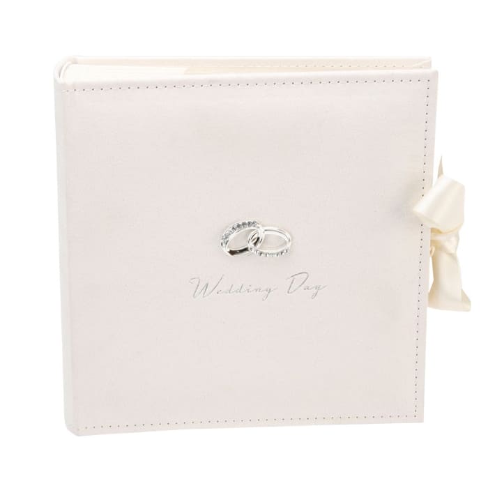 The AMORE WEDDING TRADITIONAL ALBUMN features silver embossed ‘Wedding Day’ titling, intertwined silver rings with crystal embellishments and ivory satin ribbon closure.