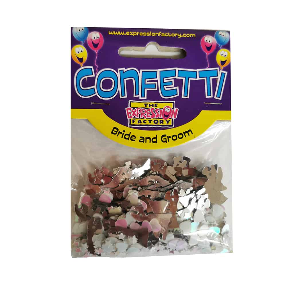This pretty confetti is made up of multi-coloured pieces with the wording ‘bride & groom’.