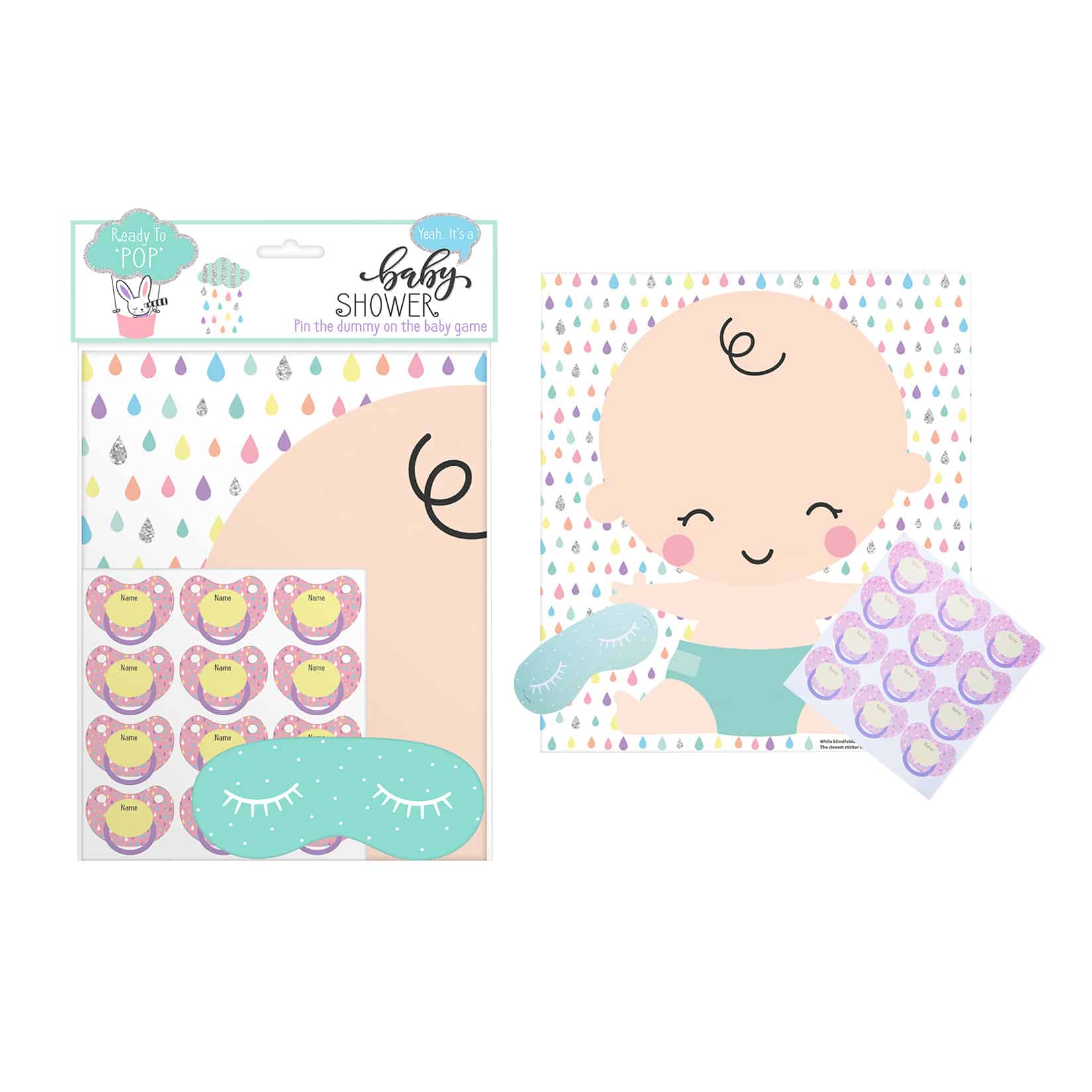 The colourful poster features a baby’s face – but he needs his dummy! With a paper blindfold and 12 dummy cut-outs included, each guest can have a turn at trying to stick the dummy in the right spot using tape or pins (not included).